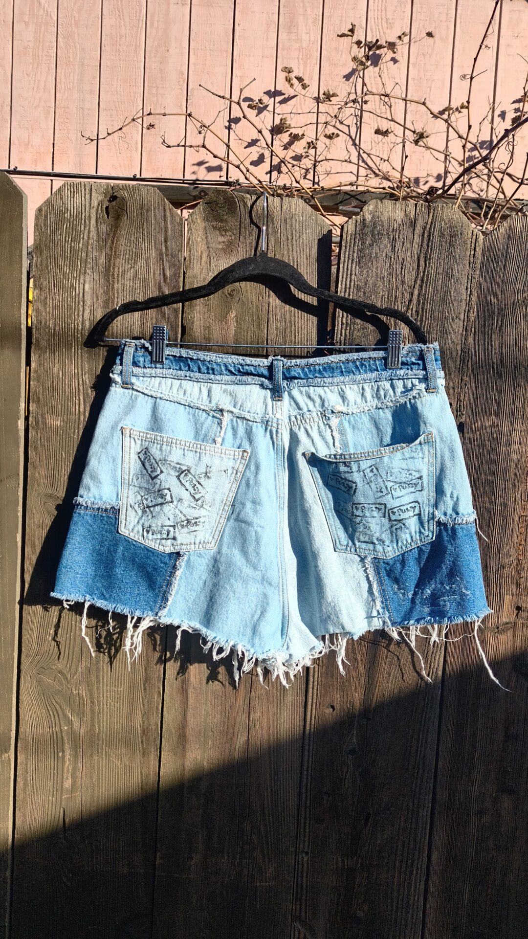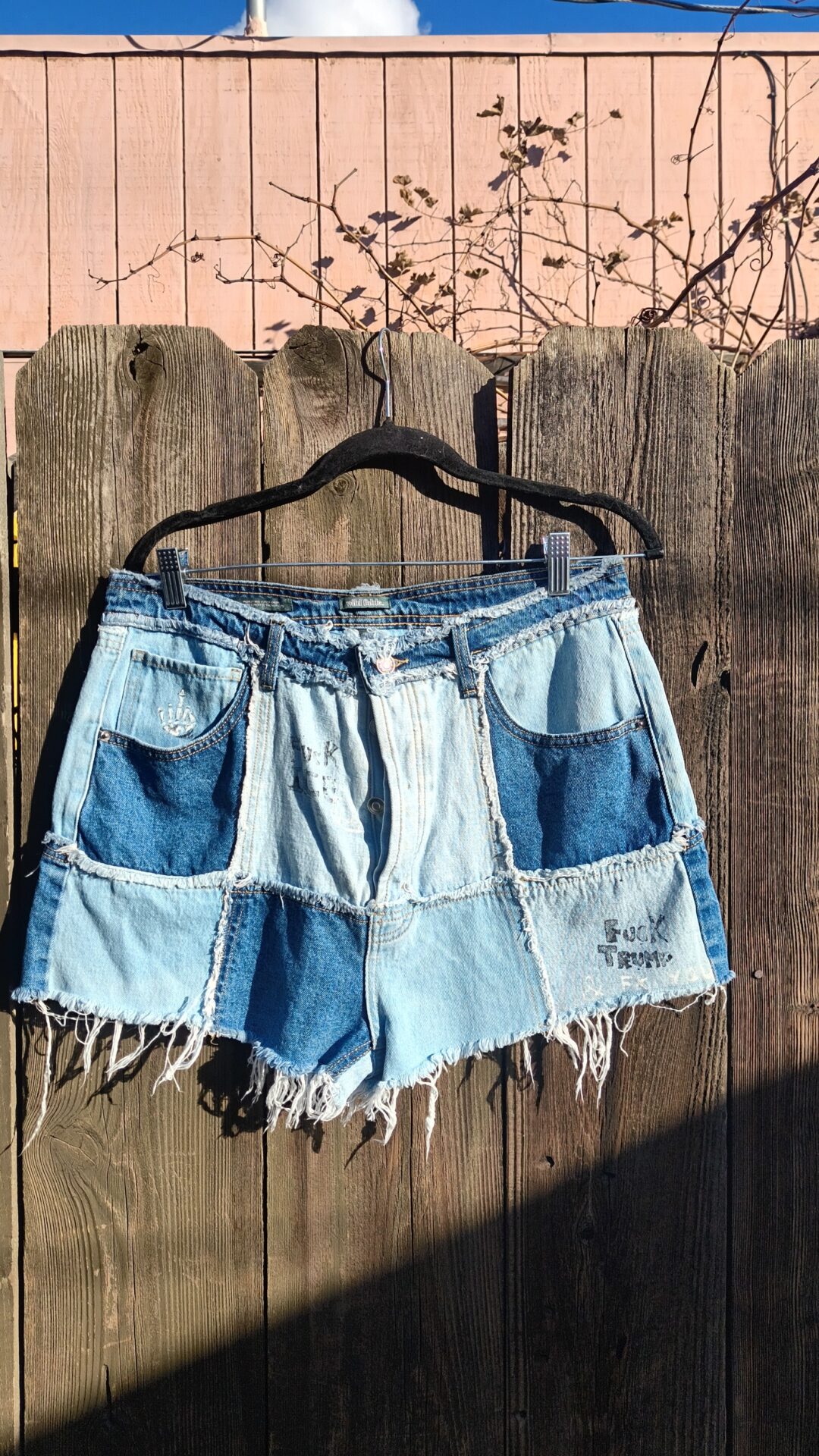 Pussy Shorts 🩳 : Thrifted denim shorts painted with hand -crafted stamps & clothing paint to remind the world what is real in my πŸ«€ heart.