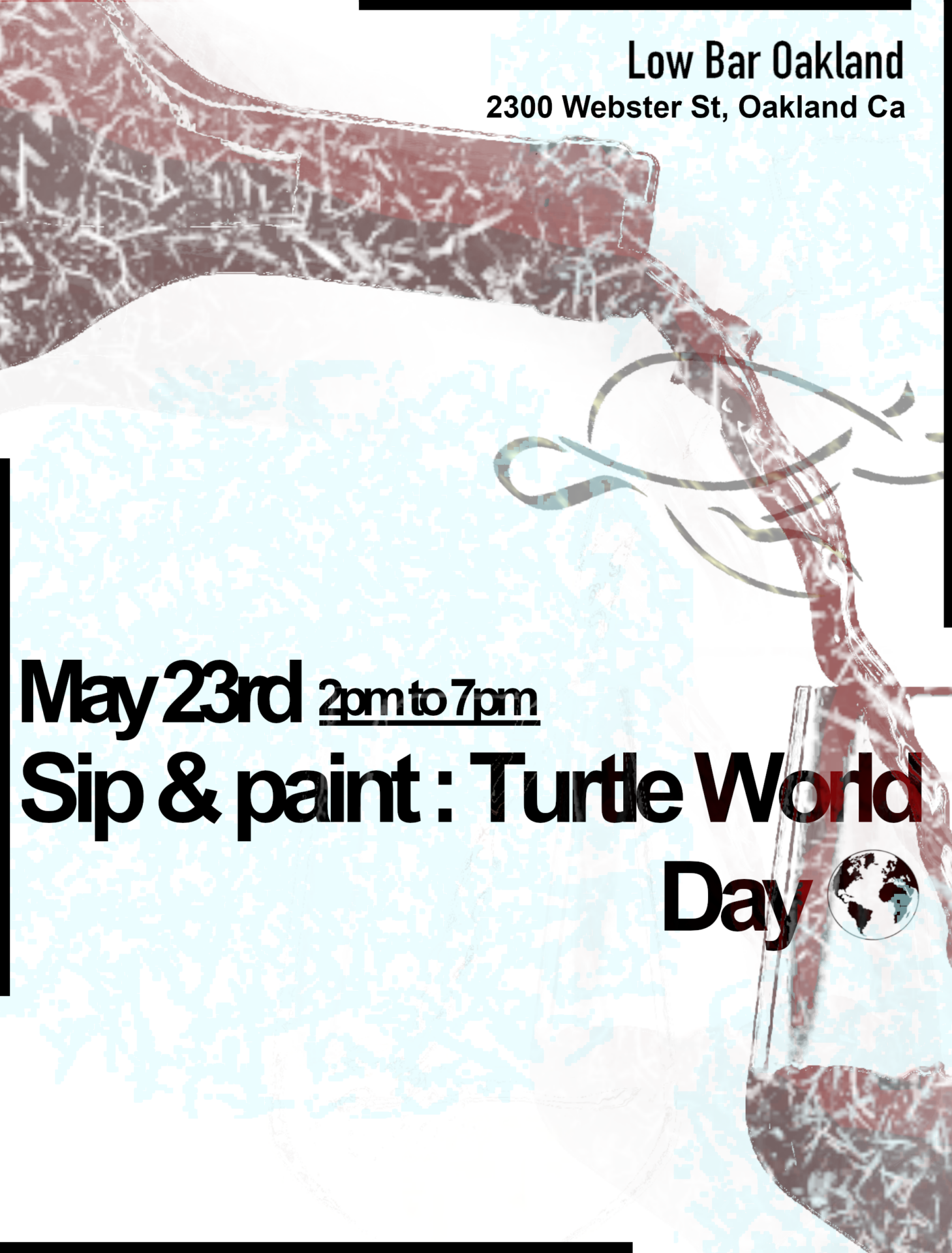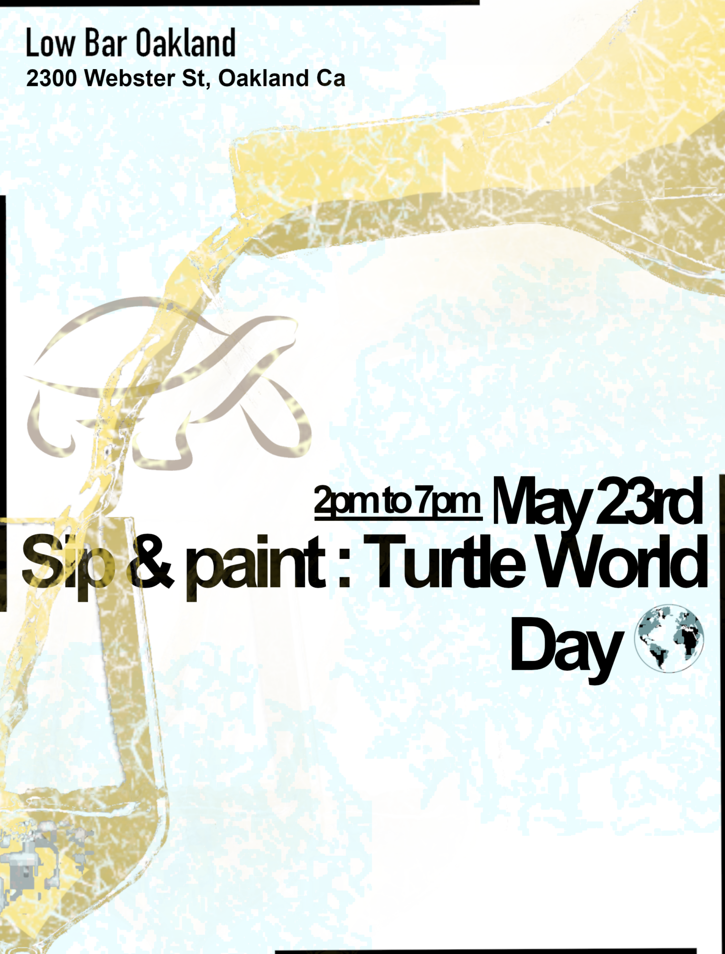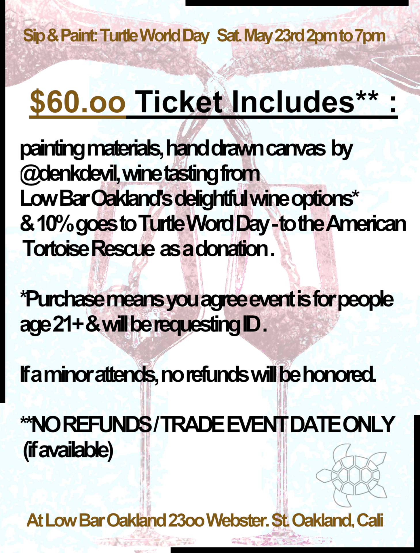 Ticket Includes** – painting materials, hand drawn canvasΒ by @denkdevil, wine tasting from Low Bar Oakland’s delightful wine options* & 10% goes to Turtle Word Day – to the American Tortoise Rescue π’ as a donation .